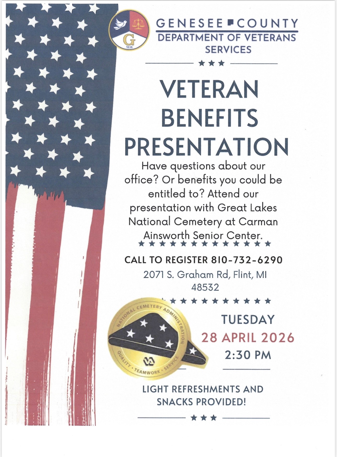 28apr2:30 pmVeteran Benefits PresentationDo you have questions about the Genesee County Department of Veteran Services Office? Or Benefits you could be entitled to? This is the presentation for you!