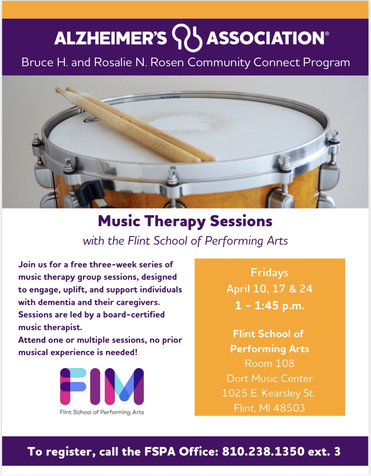 10apr1:00 pm1:45 pmMusic Therapy Sessions with the Flint School of Performing ArtsFree 3-week series of music therapy group sessions, designed to engage, uplift, and support individuals with dementia and their caregivers