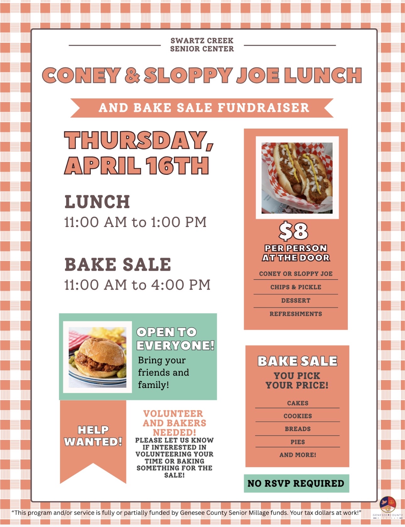 16apr11:00 am4:00 pmConey & Sloppy Joe Lunch and Bake Sale FunsraiserAll you can eat soup! Also serving coleslaw, dessert and a drink from 11am-1pm. Bake Sale from 11a-4p